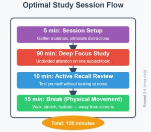 The Upanishads teach us about “Ekagrata” — one-pointedness of mind. Modern research validates this ancient wisdom through the concept of deep work. Structure your day around 90–120-minute focused study blocks: